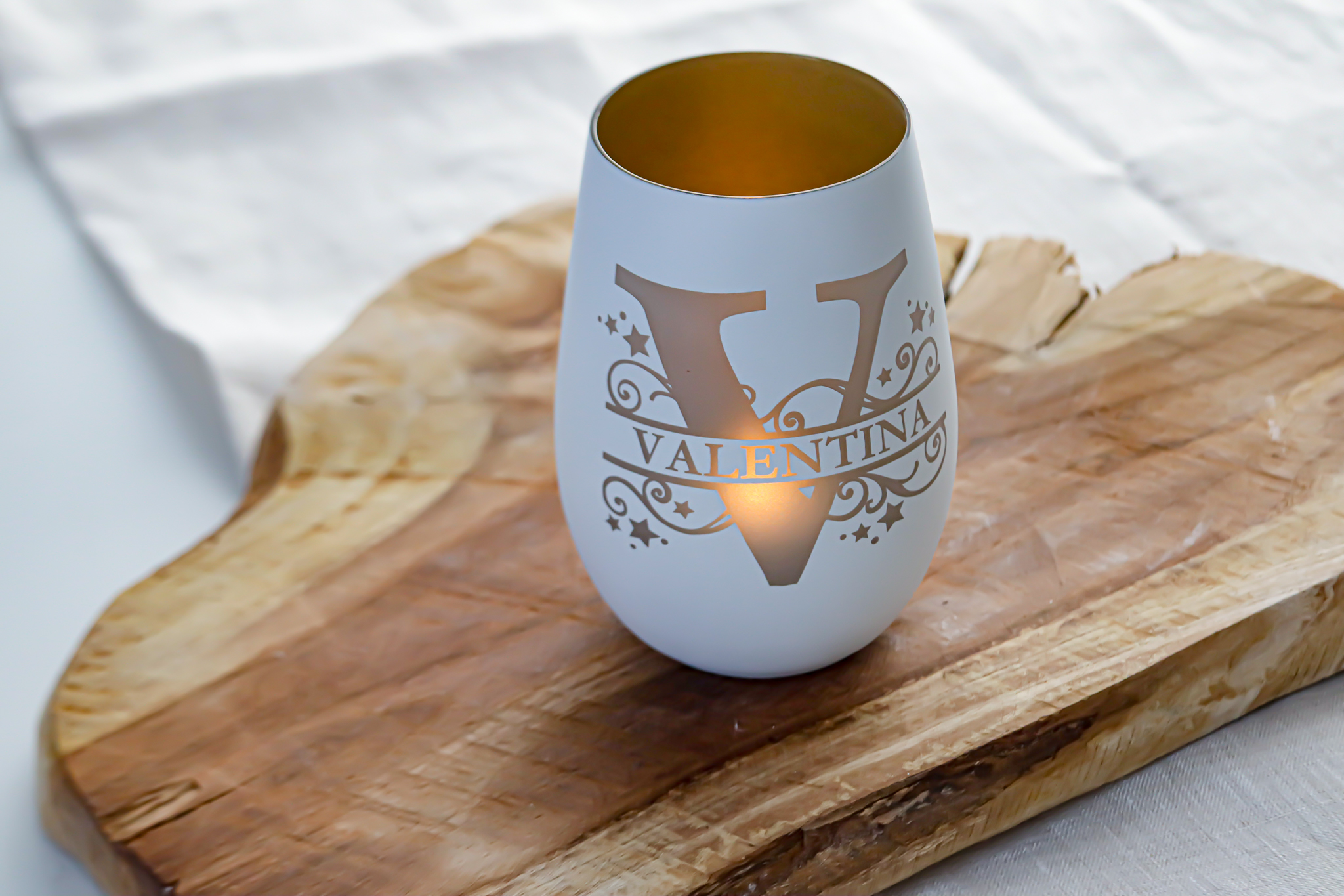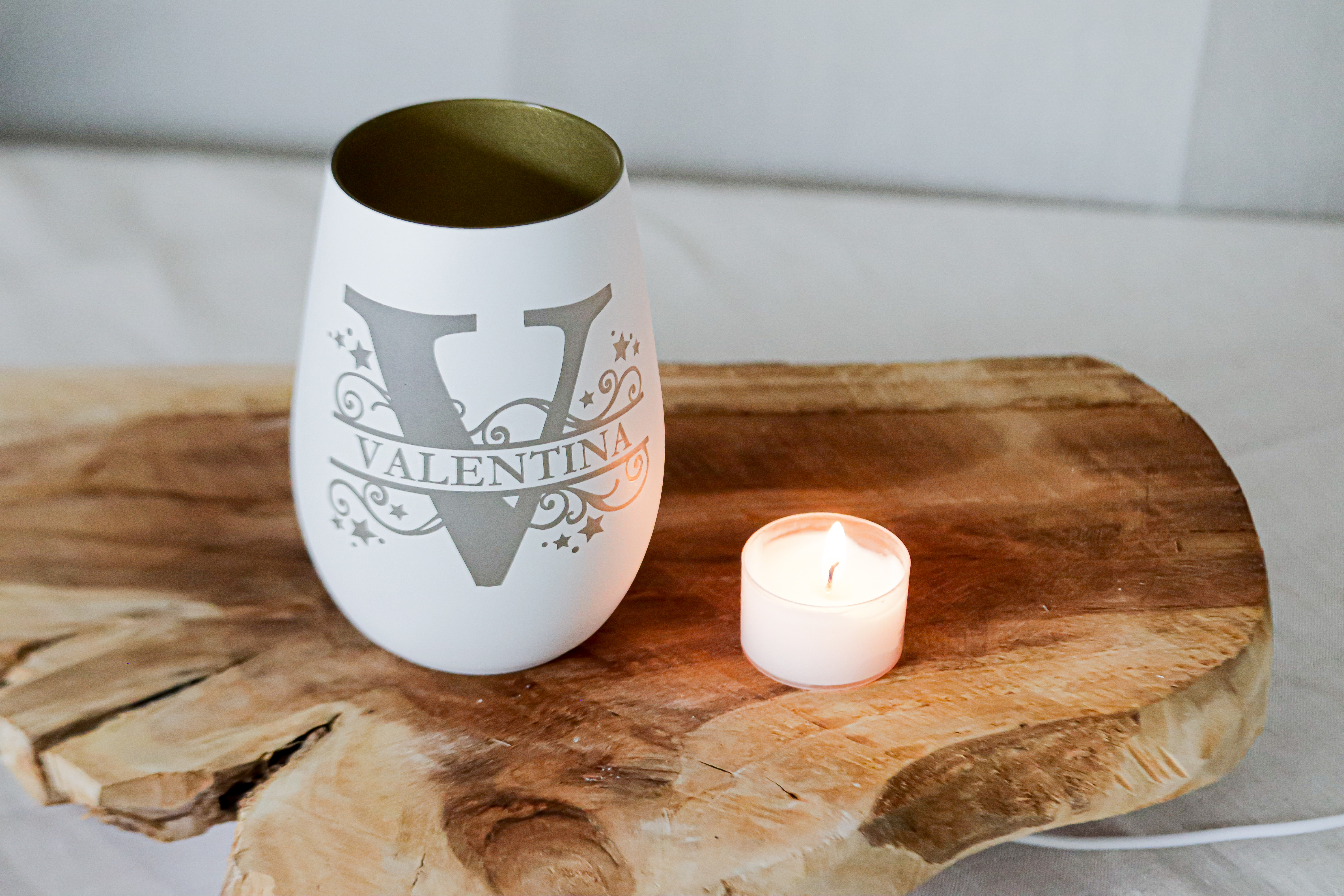 erzeugt ein warmes, helles Licht / Gravur lässt die Außenfarbe schwinden und das Licht scheint nach außen durch die Innenwand